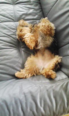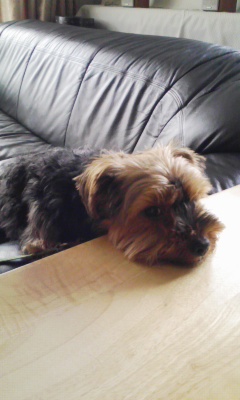 写真はカンケイないけどうちの犬のレオ、ソファに座り、サイドのワゴンにアゴをのせ、暑さのせいかぼんやりうつろな目をしています。呼んでもあまり反応なかった。