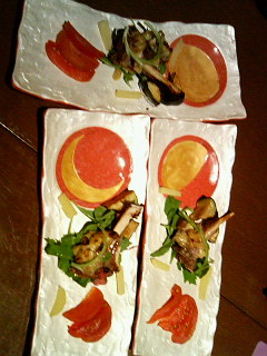 写真はコースの中のひと皿で、お皿がいろんな月のかたちをあしらっていて可愛かったので、3人分まとめて撮ってみた。